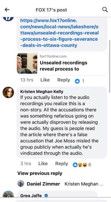 In the closed session meeting concerning Epperson, former Board Chair Joe Moss explained that, despite having filed a human resources complaint, Epperson wanted to fulfill his present duties and leave the county on good terms, without filing suit against the county. Moss explained he had discussed the matter with Ottawa County Human Resources Attorney Nate Wolf, and that [0:10] “legal council for human resources has been conducting an investigation at the request of Mr. Epperson due to potential claims against Ottawa County. [] Although HR legal council has not provided a written report, he has explained it is in the best interest of the county to get a release of claims from Mr. Epperson.”