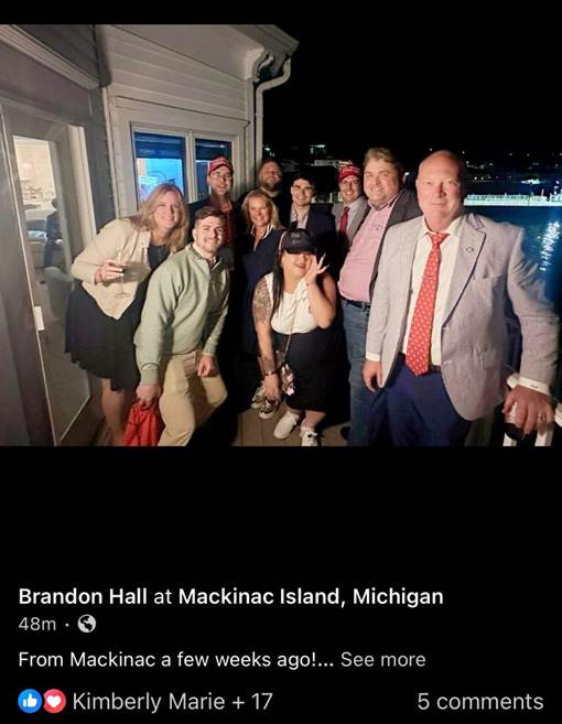 The photo below was posted on social media in October 2025 by Brandon Hall, who noted it was recently taken at a conservative event on Mackinac Island. Among others, the photo includes Hall himself and former board chair Joe Moss standing between Jordan Epperson and Benjamin Wetmore.