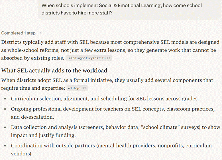 I recently entered the following prompt into Perplexity.AI: “When schools implement Social & Emotional Learning (SEL), how come school districts have to hire more staff?” It responded: