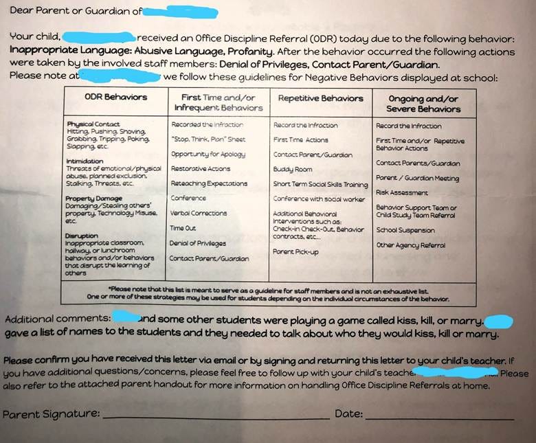 While schools should place an emphasis on identifying true threats to safety, GHAPS parents have complained the behavior tracking has gone too far. They say their children are receiving notes in their permanent files for normal childhood behaviors. For example, when elementary boys discussed whether they wanted to “kiss, kill, or marry” various girls in their class, rather than receive a simple verbal reprimand from a teacher that their game was inappropriate, parents received formal notification of behavior citations they were required to sign and return to the school.