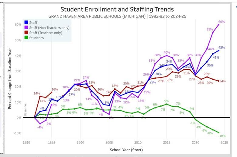 Jeff Myers from Save Oregon Schools compiled a database that generates graphs showing the Student Enrollment and Staffing trends for US school districts between 1992 and 2024. The increase in non-teaching staff at Grand Haven Area Public Schools (GHAPS) correlates with the implementation of SEL. Although there was an increase in the proportion of staff to students for the time period of 1992-2011, the ratio stayed relatively stable with a student population increase between 4-6% and a staff increase of about 18%. Then in 2011 there was a significant jump in non-teaching staff which has continued to trend upwards despite a significant decline in student population which began in 2015.